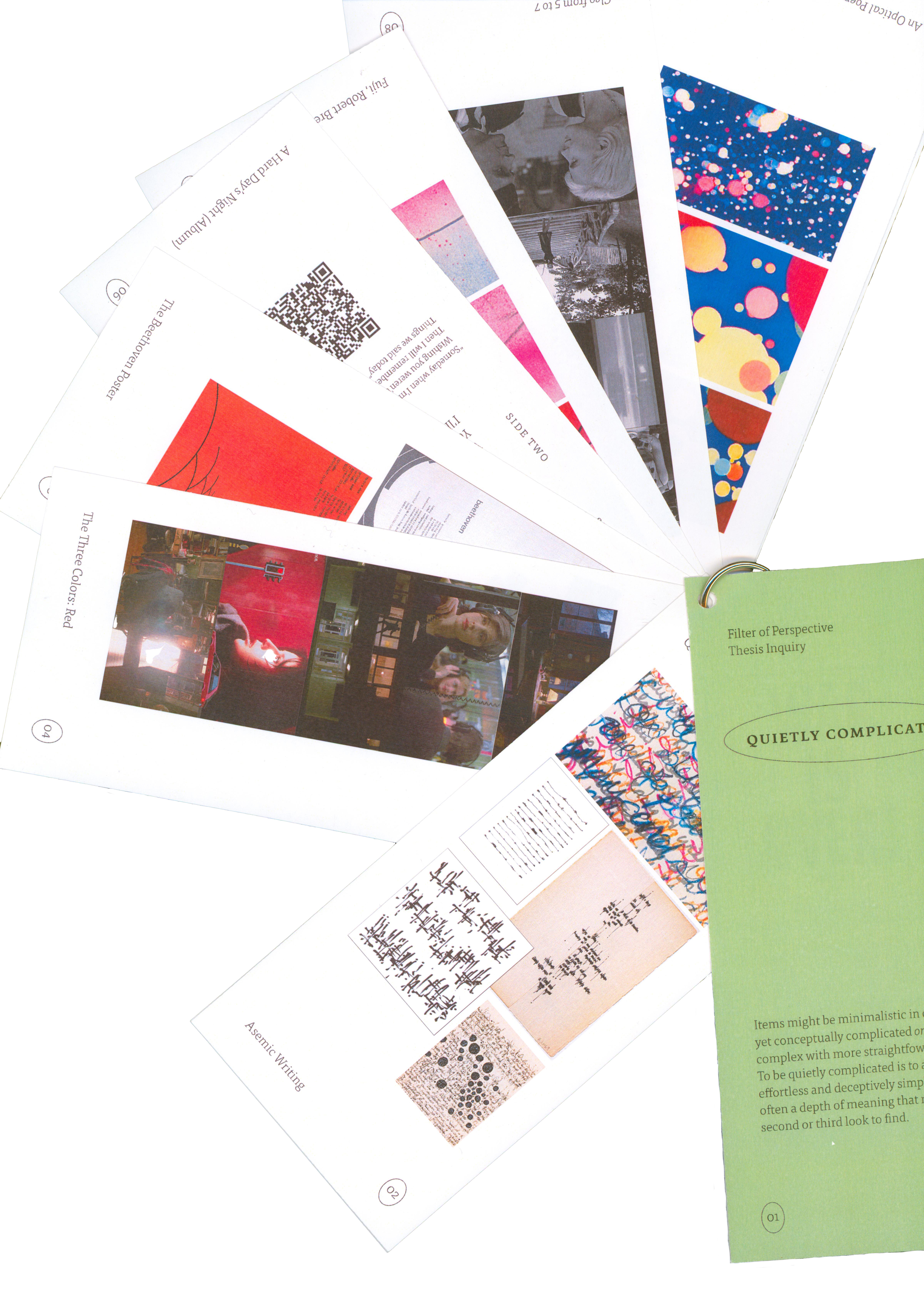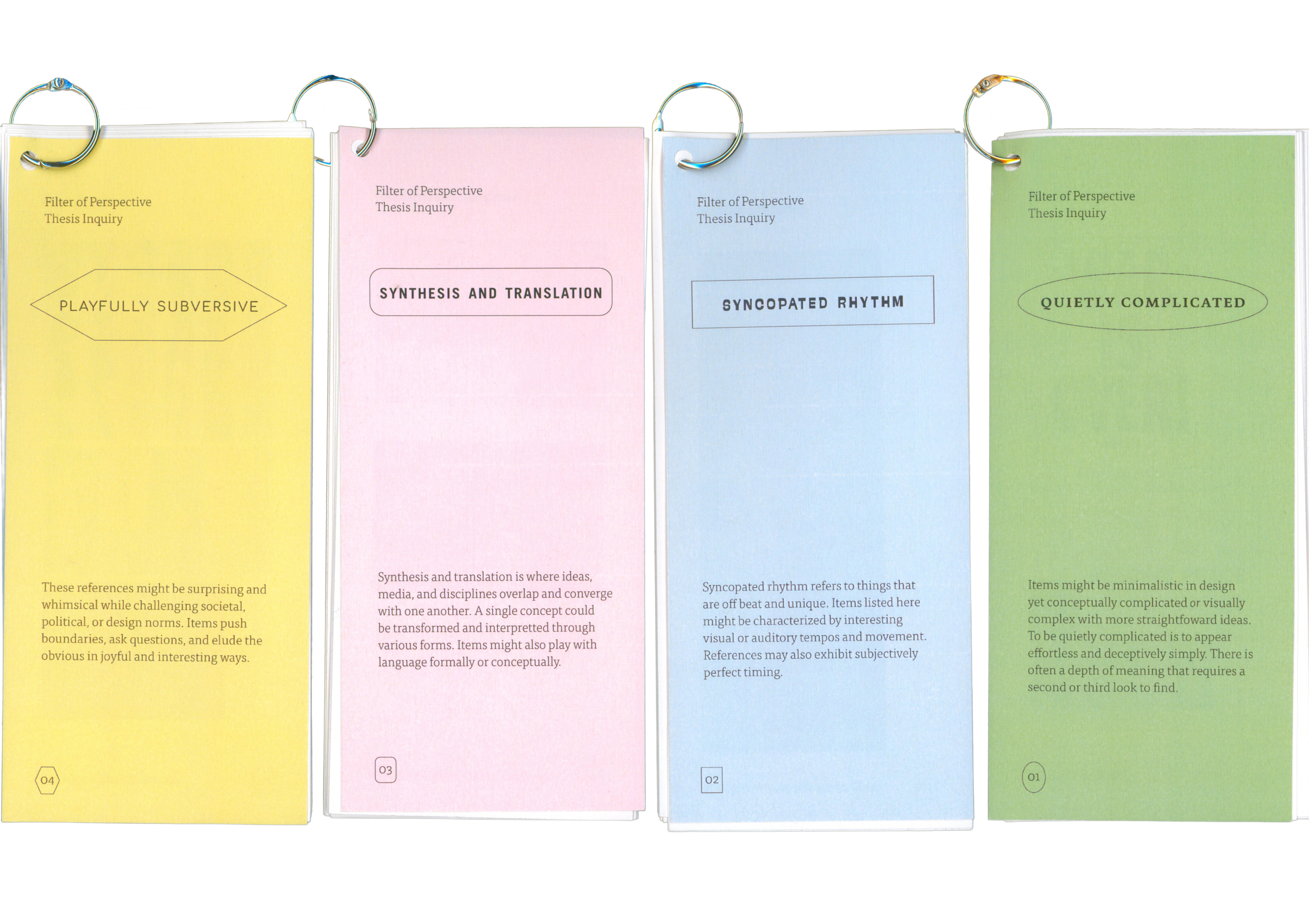 My Filter of Perspective book set takes the form of color swatches as a tool that can live in a design workspace to be easily referenced for inspiration. The format of the design allows the books to be viewed together.