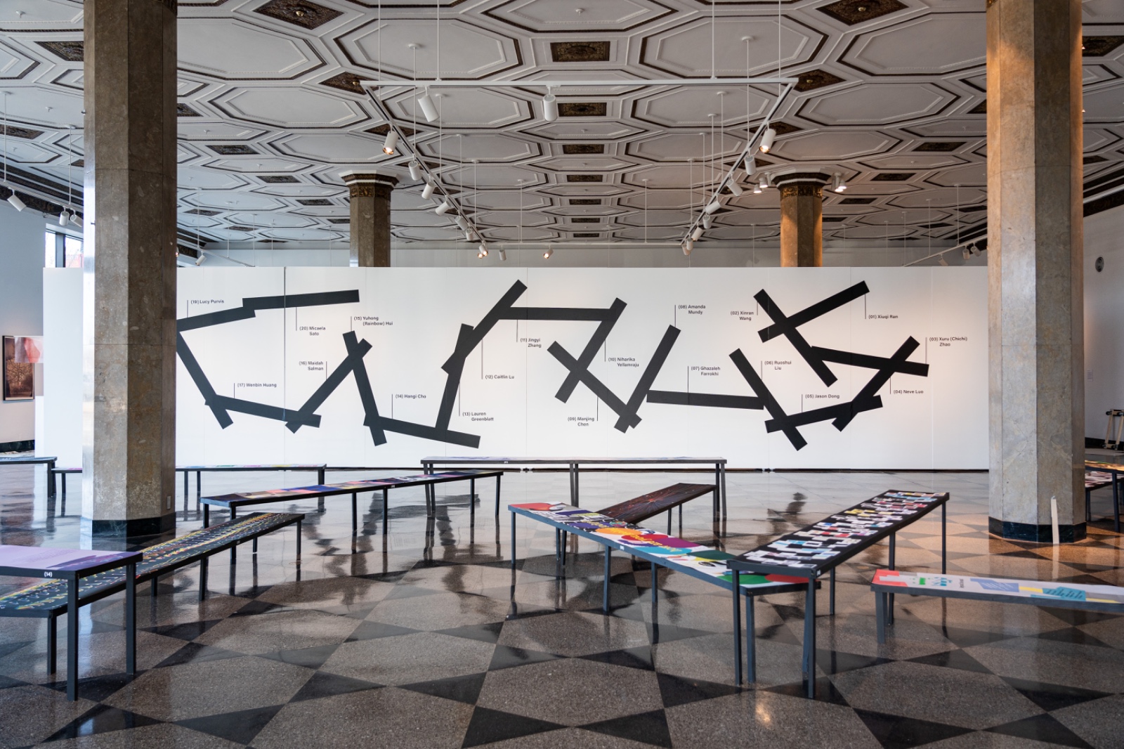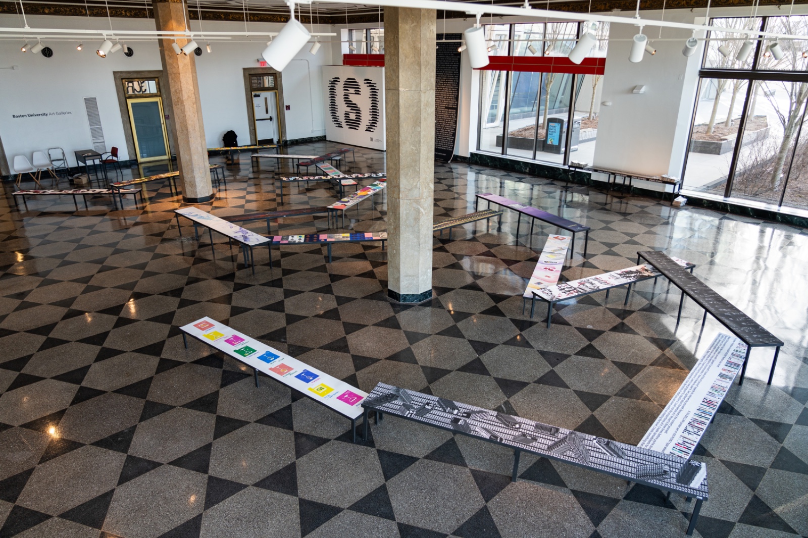 My MFA thesis exhibition, Scroll(s), examines “scroll” as both a noun and verb through its historical and ever-evolving definitions within graphic design. As a part of the methods of display team, my primary contribution was conceptualizing the show, constructing our “scroll bars” horizontal poster displays, and designing, producing, and installing the wall vinyl mural. The map corresponds to the layout of the winding poster scroll.